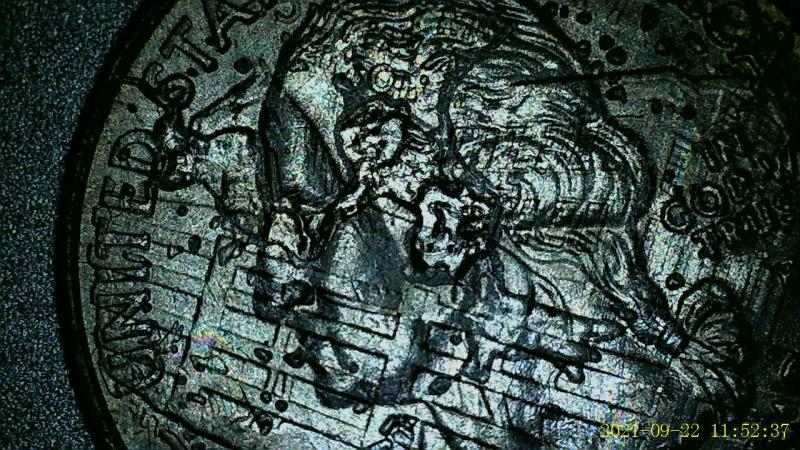 It looks like George Washington hovering over a map of Manhattan. Whatever is going on most likely happened after it left the mint, and is of little value.