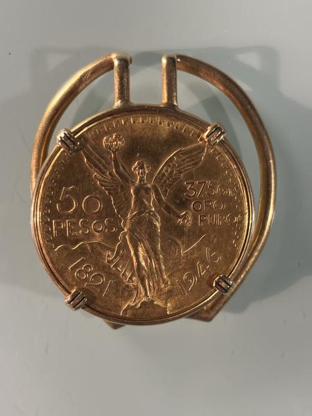 It looks like a Mexican 50 peso gold piece with a value, in jewelry, of $4,900. If the mount is 14K gold you can add a couple hundred dollars. If authentic, and it looks like it very well may be so, this was a generous gift indeed, and something special to keep in the family.
