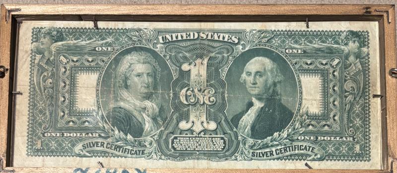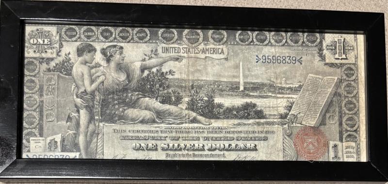 It's probably in the $100-200 range. I can't tell in a frame, if it has glue or discoloration or has been trimmed, it's worth less. This is a $1 "Education Note" probably 1896.
