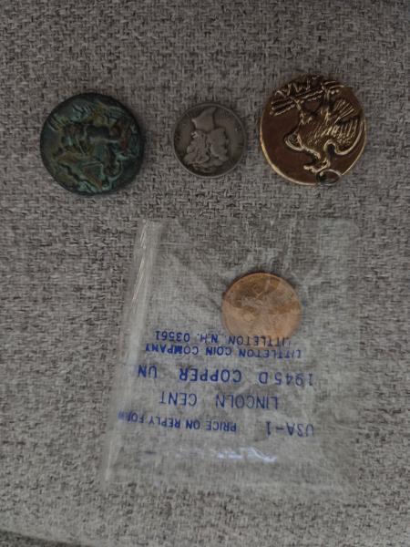 The dime has $3 of silver. The cent is nominal in value. You have an ancient that's real and worth $25 or is a reproduction (good chance). If the medal is gold you have over $100, ask a jeweler or coin dealer if you aren't sure.