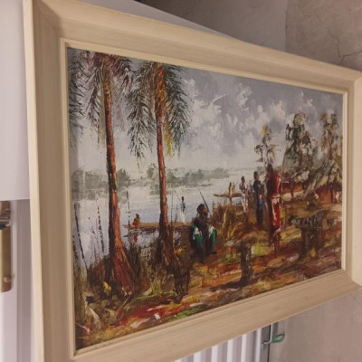 I believe he was a Congolese painter born in 1938. It's a nice piece, hard to sell. I'd call it $350 if I were doing an insurance appraisal, but if you can get $150 you can probably call yourself an art dealer. The market for secondary artists is weak.
